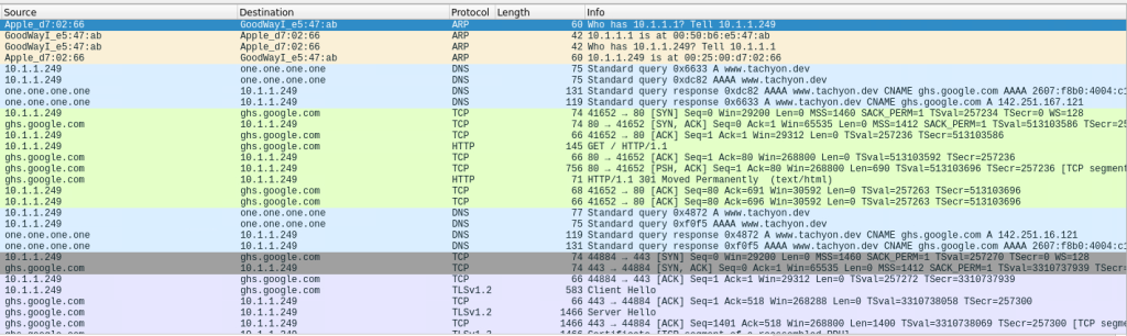 We can use tcpdump to view the file but Wireshark is much more user friendly. Below is a screenshot of Wireshark showing the capture of the MacBook (named Kildaire) visiting the wonderful website, www.tachyon.dev. Step one is Address Resolution Protocol (ARP) where the network hardware determines the IP address associated with the hardware address by asking. Apple_d7:02:66 is the address of the MacBook and GoodWayI_e5:47:ab is the address of our USB Ethernet port. Next we reach out to the DNS server at 1.1.1.1 to get the IP address of the webserver. Here we get the IPv4 (A) and the IPv6 (AAAA) address. Below the second DNS request we see the TCP connection and the Transport Layer Security (TLS) handshaking indicating the website is hosted using Secure HTTP (https).