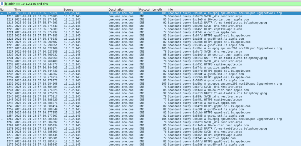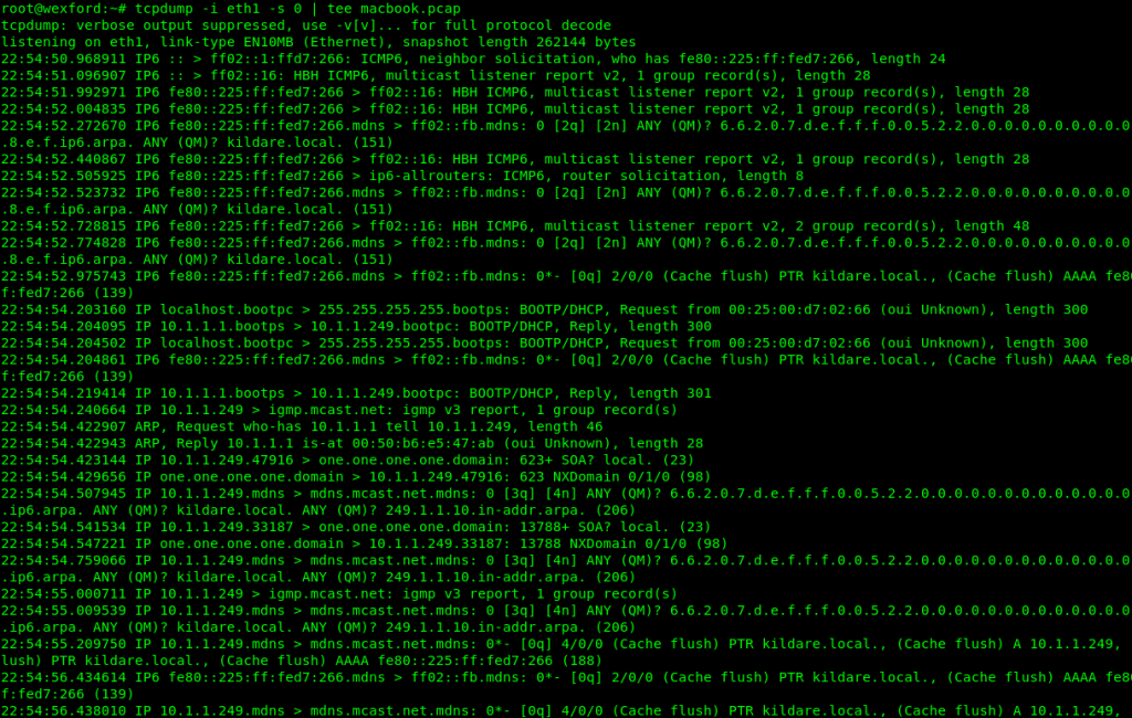 Our sheltered device now has its own subnet and access to the Internet. Now comes the payoff, since all of the traffic is going through the network device eth1 on the Pi router we can listen in on that device to eavesdrop. For this we use a program called tcpdump which listens to a network device and dumps the packets into a pcap file. For this post I have also tee’d the packets to standard out (stdout).