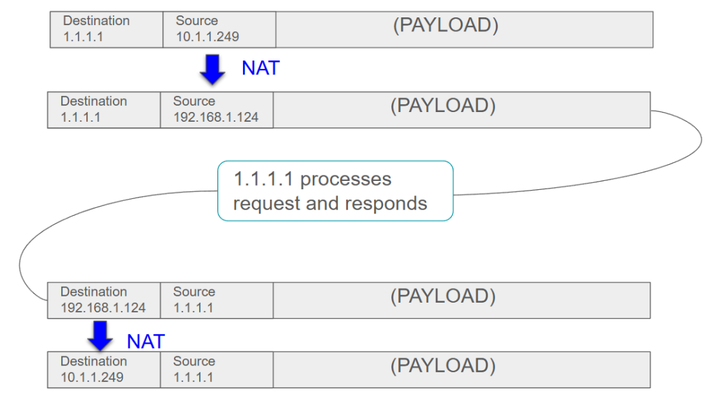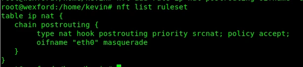 Network packets contain a source and destination address. The post-routing chain in the NAT table tells NFT to rewrite (or masquerade) the source address to whatever IP address of eth0 is. When we receive a reply, NAT knows to forward that packet to the ten-dot address that sent it. The server out on the internet doesn’t know the real address of the client and doesn’t need to know it to respond. The NFT router acts as the go-between.