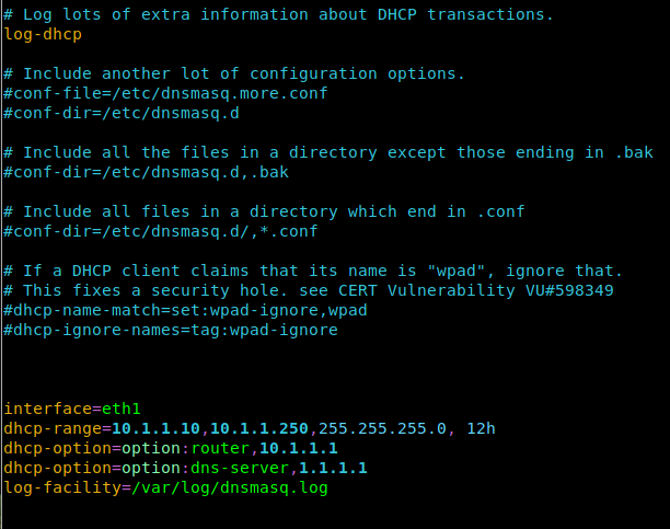 We are going to be using a service called dnsmasq to implement DHCP. I updated the config file to listen on our USB interface (eth1) and to assign IPs from 10.1.1.10 through 10.1.1.250 with the 255.255.255.0 subnet mask (which is the same as /24). 12h here is to specify a 12 hour DHCP lease.
