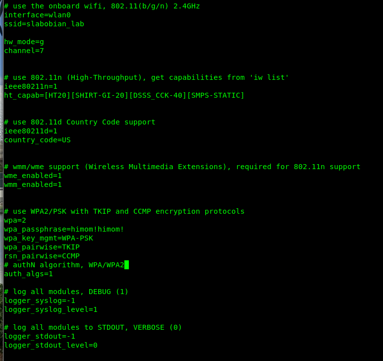We are going to set up the wireless network “slabobian_lab” with the password, “himom!himom!” on the wlan0 interface.