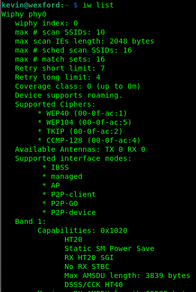 First we run the “iw list” command to see all of our Wi-Fi devices and their capabilities. In this case we just have the one device which is labeled “phy0”. Under “Supported interface modes” we see “AP” listed, that means we are good to go. We should also note the capabilities under Band 1. We will be using this info next when we create the HostAPd config. If you do not see a capabilities section then your Wi-Fi adapter probably doesn’t support 802.11n