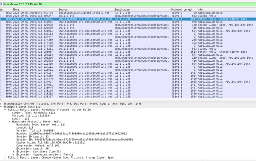 That’s a lot of requests! You can see the phone reaching out to Apple and T-Mobile so you can probably guess what kind of phone I have and which carrier I use. While the phone was connected I also browsed over to Slashdot.org. Here you can see I was browsing using https. I expanded the TLS handshake so you can see the cipher suite used: