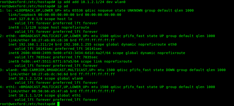 The Raspberry Pi 3B has a built in wireless adapter. We are going to see if it is capable to be a WiFi Access Point (AP) and if so, we are going set it up as one. Any device that connects to this AP will get an IP address from our DHCP server and get to the Internet through our router that we set up previously.